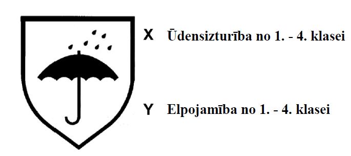 Ja meklē ūdensnecaurlaidīgu un elpojošu apģērbu – pievērs uzmanību piktogrammai ar lietussargu.