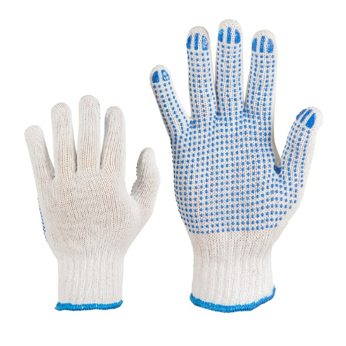 Adīti tekstila darba cimdi ar PVC punktiem no vienas puses.